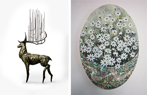 최승애 作_도란도란_resin크롬_28x20x35cm_2022 (좌) 최정숙 作_별내리는섬백령_mixed media_53.0x45.5cm_2022 (우)