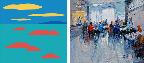 한명일 作_섬4_digital print_45x45cm_2022 (좌) 홍경표 作_20220728색1_oil on canvas_53x45cm_2022 (우)
