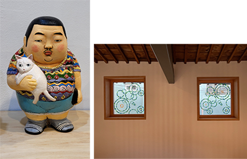 김원근 作_양집사(야옹이 매니아)_세라믹 유약_20x15x33cm (좌) 신지우 作_푸르른 날엔 사랑을 해요_glass_77x78.5cm_2022 (우)