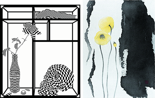 이의재 作_흐름-파동-1_장지에 먹+채색_45.5x38cm_2022 (좌) 이정순 作_내안에 설레임_ Mixed media on paper_39x45.5cm_2004 (우)