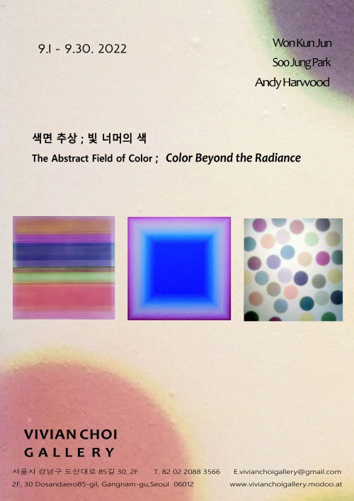 비비안초이갤러리는 회화의 가장 본질적 요소인 색에 중점을 두고 반복된 수행이 축적된 화면을 통해 회화에 시각적 공간과 빛을 담아내는 세 명의 작가, 전원근, 박수정, 앤디 하우드 Andy Harwood 의 3인전, 《색면 추상; 빛 너머의 색 The Abstract Field of Color; Color Beyond the Radiance》을 개최한다.