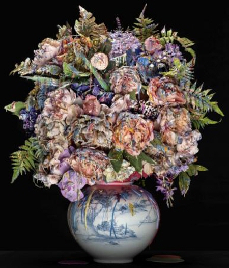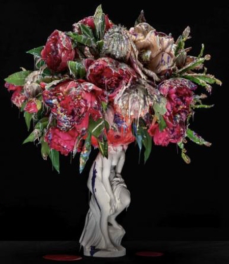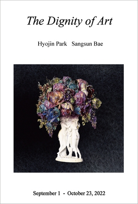 박효진의 작품들은 그런 슬픔 괴물을 닮았다. 바닥을 지탱하고 있는 니케, 다비드, 포세이돈, 성모상 등은 가장 이상적인 인간의 모습이거나 인간의 이상향을 대변하고 있는 신화 속 인간적인 신들의 모습이며, 청화백자는 가장 고도의 문화적 완성품을 대변하고 있다. 이는 이상화된 인간의 모습이거나 고도의 문화적 산물은 인간이 꿈꾸는 현실의 모습을 보여준다. 이러한 바닥을 딛고 있는 현실적 이상화의 모습과 달리, 위의 화려한 꽃들은 더 높은 욕망의 산물이며, 닿을 수 없고 도달할 수 없는 이상향의 모습을 보여준다. 계절과 시간에 상관없이 흐드러지게 피어있는 화려하기 그지없는 이 미친듯한 꽃의 향연에 색색의 물감들이 끼얹어져 있다. 숨을 돌릴 수도 없이 강렬함으로 욕망을 분출하는 이 꽃다발들은 그러나 가장 화려한 상태에서 멈추어져 있는 조화이며, 거세된 욕망에 다름 아니다. 바닥을 지탱하고 있는 조각상과 청화백자가 진정성이 있는 진품이 아닌 작가가 시장에서 구입한 복제된 가품이듯이 우리가 꿈꾸는 현실은 그것만으로도 진짜가 아닐 수 있다. 또한 우리의 욕망의 산물과 이상화는 가장 화려한 모습을 하고 있으나 그것은 거세되고 죽어있으며, 그 터져 나오는 색채는 피를 흘리듯, 눈물을 흘리듯 아래로 향하고 있다.