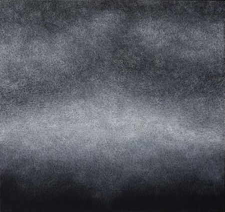 작가는 벨벳처럼 중성적이지 않은 표면 위에 무수한 선을 그으면서 서사의 과정에 상응하는 행위의 흔적을 남긴다. 지상적 존재가 유한한 삶을 살며 오갔던 발자국 같은 무명의 흔적이다. 흔적은 길 위에도 길 밖에도 있다. 드로잉 기반의 작품은 드로잉이 쓰기의 연장임을 알려준다. 쓰인 것 위에 또 쓰이기를 반복한 사연은 명쾌하게 읽을 수 없다. 멀리서 본 화면에 파손된 기호 같은 형상이 떠도는 것은 우연이 아니다. 몸에서 출발한 지글거리는 복잡한 선적 운동은 고요한 초월과는 거리가 있다. 화면을 확대해도 흐트러지지 않는 작품의 밀도는 각자 유일한 삶을 영위하는 듯하지만, 차원을 달리해서 보면 격세 유전적으로 반복되는 것이 있다. 멀리서 보면 인간의 역사도 자연과 크게 다르지 않다. 삶의 의미는 있을 수도 없을 수도 있다. 어두운 바탕에 수없이 그어진 선은 어떤 명확한 형태, 즉 의미로 귀결되기보다는 생성과 소멸의 흔적 그 자체로 남아 있다.