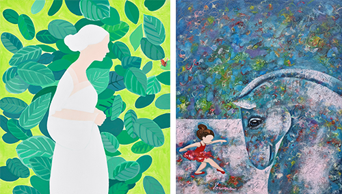 오경아 作_눈맞춤_캔버스에 아크릴_53x45.5cm_2022 (좌) 유미정 作_horse, 온실_Mixed media on canvas_53x45.5cm_2022 (우)