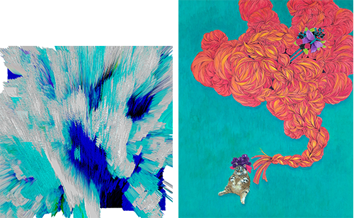 이보경 作_숲02_digital artwork, digital print_50x50cm_2022 (좌) 이승은 作_가채 놀이_한지에 채색_50x67cm_2022 (우)