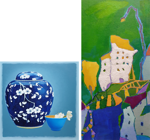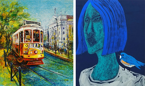 정은하 作_꿈꾸는 여행자57-리스본_mixed media on canvas_45x53cm_2021 (좌) 주혜인 作_블루 bird_장지에 분채_40.9x31.8cm_2022 (우)