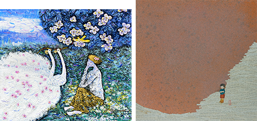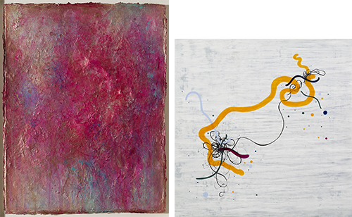 박천숙 作_하늘꽃-하모니_장지,한지에 분채_45x53cm_2021 (좌) 박혜경 作_202022_Mixed media on canva_53x45.0cm_2020 (우)