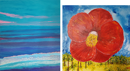 김경미 作_어머니의 바다 2-7(Mother's Sea)_Mixed media on canvas_53.0x45.0cm_2022 (좌) 김미순 作_Dream of Camellia_Acrylic on Canvas_50x50cm_2021 (우)