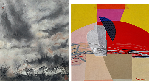 김반산 作_A Sound-the Earth_종이에 수묵 담채_53x45.5cm_2021 (좌) 김연옥 作_play of color_mixed media_45x45cm_2022 (우)