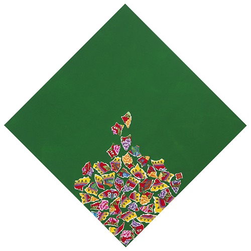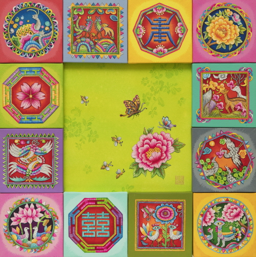 정하진은 이번 개인전의 부제를 ‘그림에 수를 놓다’로 정했다. 그림 위에 직접 수를 놓는다고? 아니다. 그녀의 작업은 전통 '자수(刺繡) 공예'에서 볼 수 있는 실로 수놓은 형상과 흔적을 새롭게 번안해서 ‘천 위의 바느질’이 아닌 ‘종이 위의 붓질’로 옮기는 것이다. 전이모사(轉移模寫)를 행하는 손의 재현 기술이 워낙 출중해서 정하진의 회화 작품 앞에서 관자는 마치 실제 천 위에 수놓은 자수 공예를 보는 듯한 착각을 불러일으킨다. 가히 트롱프 뢰유(Trompe-l'oeil)라고 하는 ‘눈속임 회화’를 보는 것처럼 정밀한 재현의 언어는 감탄스럽다. 실상 트롱프 뢰유가 지니는 마술적 효과는 르네상스 이래 고전적 회화가 지닌 덕목이었다. 따라서 실제의 것으로 착각할 정도로 세밀하게 묘사한 정하진의 그림 앞에서 “아! 이거 수놓은 것이 아니라 그린 거예요”라는 놀라움 가득한 관객의 질문은 오히려 자연스럽기조차 하다. 뿐만 아니라 작가는 자신의 조형 언어로 이러한 전통을 현대적으로 변용한다. - 김성호 미술평론글 발췌