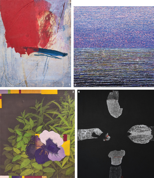 1. Yi, Mi-yeun 作_2018 -1_15x18 inch_Acrylic on Hanji (Korean paper)_2018 2. Chae, Soung-sook 作_Lines_16x16 inch_Mixed media on canvas_2021 3. Lee, Soon-ae 作_Stroll about_21x18 inch_Mixed color on cotton 4. Lee, Sang-uk 作_Space-time memory 22 a circle II_21x18 inch_Ink on paper_2022