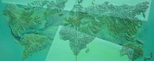 의미가 그렇다면 형식은 어떤가. 작가는 화면 위에 실을 붙이고, 그 위에 채색을 입힌다. 그렇게 기하학적 형태가 강한 색면추상을 예시해준다. 밝은 면과 상대적으로 어두운 면이 적절하게 어우러진 화면이 감각적 쾌감을 준다. 여기서 촘촘하게 덧붙여진 실이 결을 떠올리게 하는데, 아마도 작가 자신의 내면에 연유한 결, 그러므로 마음의 결을 표상할 것이다. 마음에 울리는 소리, 그러므로 내면의 소리를 표상한다고 해도 좋다. 자기 내면에 내적 질서의 성소를 구축하려는 기획이라고 해도 좋다(실제로도 예로부터 기하학적 형태는 질서를 표상한다). 그렇게 하나의 화면 속에 밝은 면과 어두운 면이, 크고 작은 면이 어우러지고 있다. 그리고 어떤 면은 흡사 창문처럼 보이고, 부드럽고 온건한 빛의 기운이 흘러드는 문틈처럼도 보인다. 아마도 실제로 관찰한 빛, 그러므로 물질적인 빛을 재현한 것이라기보다는 내면의 빛의 기운을 표현한 것일 터이다. 희미한 기억으로 남은 빛의 잔상을 표현한 것일 터이다. 기억으로 남은 주지하다시피 창문은 세계와 세계를 연결하는 통로며 관문을 상징한다. 아마도 작가는 그 통로를 통해 빛의 질감으로 자신을 감싸던 유년의 기억을 되불러오고 있는지도 모른다. 그렇게 자기 치유와 정화를 실천하고 있는지도 모른다. 그렇게 작가의 작업에서 색면추상은 자기 내면에 질서의 집을 지으려는 기획으로 보이고, 따스한 빛의 질감으로 남은 유년의 기억을 소환하는 계기로 보인다. 이처럼 작가의 작업에서 색면추상은 엄격하면서도 따스한, 부드럽고 온건한 느낌이다. 그리고 작가의 작업은 근작에서 좀 더 유기적인 형태로 변신을 꾀하는데, 화면 속에 산과 같은, 능선과 같은 풍경을 떠올리게 만드는 요소를 어필시키는 것이 그렇다. 기하학적인 형태로부터 유기적인 형태로, 색면추상으로부터 풍경화로의 변신을 보여준다고 해야 할까. 이처럼 소재가 달라진 만큼 바탕화면을 이루는 실의 용법 또한 다르다. 이번에는 일정한 크기로 자른 토막 실을 중첩해 산을 만들고 풍경을 일구는데, 마치 먹그림에서의 준을, 필을, 획을 떠올리게 된다. 빛의 질감을 형용하던 마음의 결이 풍경의 결로 옮아왔다고 해야 할까. 이처럼 모든 존재에는 결이 있다. 마음에도 결이 있고, 풍경에도 결이 있다. 질 들뢰즈는 인간의 의식에도 결(주름)이 있다고 했다. 결은 접혀 있어서 접힌 부분은 잘 안 보인다. 아마도 상처가 깃든 자리라고 해도 좋다. 그러므로 존재(그리고 풍경)의 결은 동시에 존재(풍경)의 상처이기도 할 것이다.