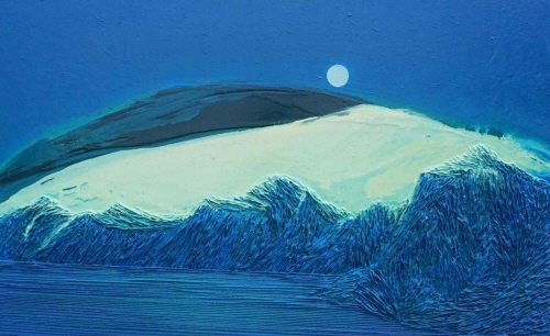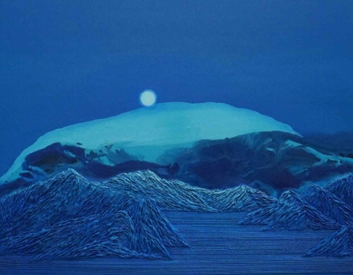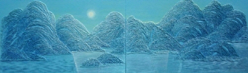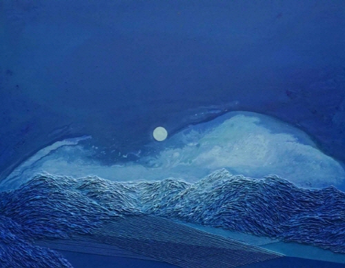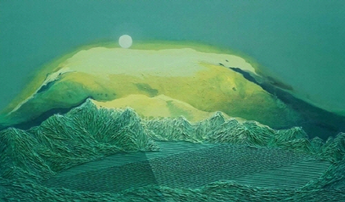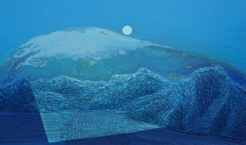 촘촘한 결이 있는가 하면 성근 결도 있다. 결에 변화를 주면서 울울한 산세를 표현하고, 완만하게 흐르는 능선을 표현하고, 산맥과 산맥이 연이어진 계곡을 재현한다. 그리고 산 위에는 해(아니면 달이라고 해도 좋을)가 떠 있어서 산 능선을 부드럽게 비치고 있다. 작가가 유년의 기억으로부터(그러므로 창문을 통해) 소환한 빛의 질감이 또 다른 표현을 얻고 있다고 해도 좋을 것이다. 여기에 작가는 마블링 기법을 도입해 산인지 하늘인지 모를, 멀리 보이는 산이라고 해도 좋고, 산 위로 내려온 하늘의 기운이라고 해도 좋을, 그리고 그렇게 산과 하늘의 경계를 허무는 풍경을 예시해준다. 기하학적인 형태와 유기적인 풍경, 그리고 여기에 비결정적인(움직이는) 하늘이 어우러져 현실 속 풍경과는 사뭇 혹은 많이 다른 느낌의 풍경을 예시해준다. 아마도 현실 속 풍경은 다만 참조할 뿐, 색면추상과 마찬가지의 기억을 더듬어 그린 풍경이라고 해도 좋고, 이상향 이라고 해도 좋을, 그런, 내면 풍경을 그린 것일 터이다. 그렇게 작가의 작업에서 색면추상과 풍경이, 기하학적 형태와 유기적인 형태가 사로 구별되면서 합치된다. 작가는 이 일련의 그림들을 <Exposed in light_code of life>라고 부른다. 삶의 코드를 빛으로 드러낸다는 의미다. 빛의 질감을 매개로, 그리고 여기에 실의 질료를 매만지는 손길을 통해 자기 내면의 추억을, 기억을, 욕망을, 관계의 감정을, 그러므로 삶을 표출한 그림으로 이해하면 좋을 것이다. 실제 하는 창문이며 현실 속 풍경을 그린 것이라기보다는, 다만 희미한 기억을 더듬어 구축한 내면 풍경으로 보면 좋을 것이다. 그렇게 자기 치유며 정화를 실현한 그림으로 보면 좋을 것이다.