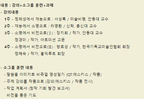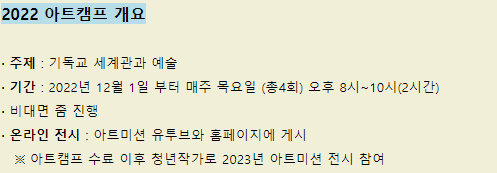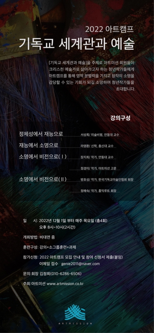 2022 아트캠프는 [기독교 세계관과 예술]을 주제로 아트미션 회원들이 크리스천 예술가로 살아가고자 하는 청년작가들과 동행하며 안내자가 되길 자청합니다. 아트캠프를 통해 영적 분별력을 가지고 창작의 소명을 감당할 수 있는 기회가 되길 소망하며 많은 참여 바랍니다.