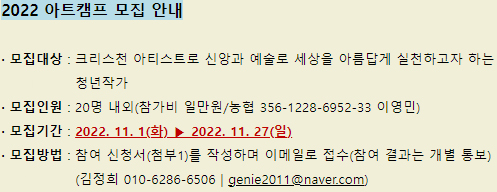 * 전시메일에 등록된 모든 이미지와 글은 작가와 필자에게 저작권이 있습니다. * vol.20221101-2022 아트캠프 모집 |