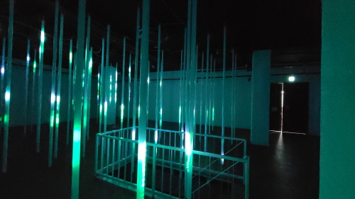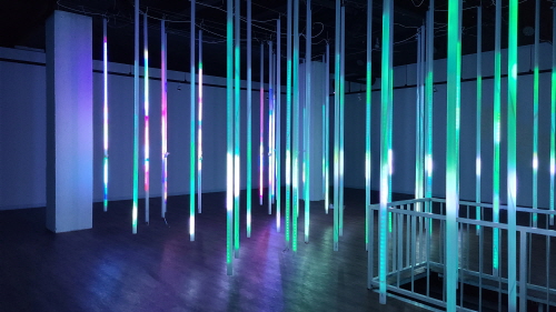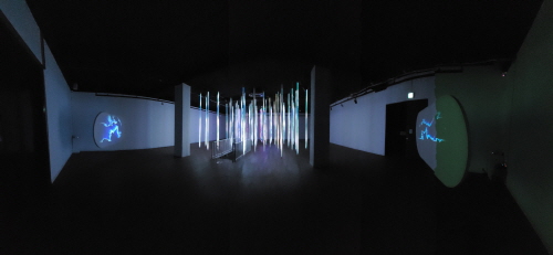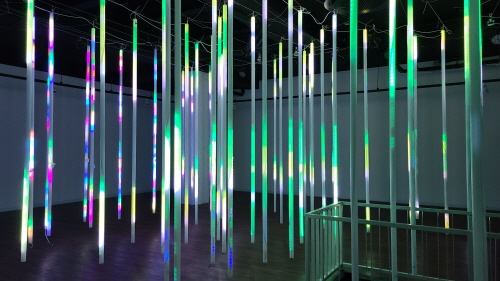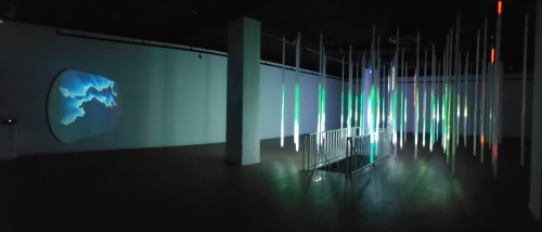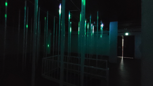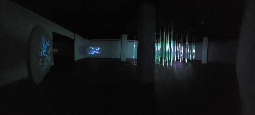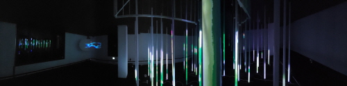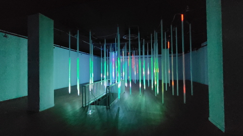 ‘빛의 숲’은 ‘Generative Wave’에서 나타나는 상승과 하강의 힘의 작용의 결과를 공간적, 신체적인 규모로 체험할 수 있도록 하고자 의도한 작업이다. 자연 현상이 그 현상 뒤에 원인이 되는 힘들의 작용이 있든, 결과인 형태를 만들어 내는 것에서 벗어나 형태를 지지하고 있는 힘, 조건, 바탕들을 통하여 형태를 생성해 내는 과정은 인간적 행위성보다 더 자연을 닮은 작업 방식이라고 생각하였다. 들이쉬고 내 쉬는 숨에 서로 다른 방향성의 힘이 있듯이, 순환하는 힘의 움직임에 둘러싸인다. 각각의 기둥들은 하나의 개별자처럼 존재하지만 이들을 관통하는 빛의 흐름은 숲 전체를 일렁거리게 한다. ‘나’라는 객체를 잠시 놓아두고 나를 포함한 생명을 둘러싼 에너지의 흐름 사이에 존재하는 경험을 상상한다.
