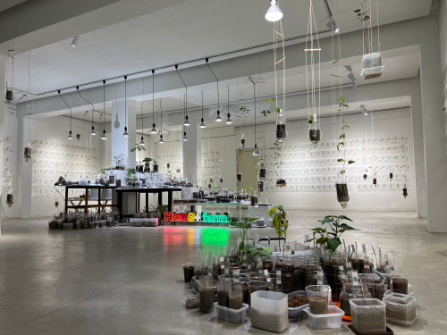 홈플러스 농장 Home+Farm 2022_가변설치_ 플라스틱 포장재에 겹겹이 쌓여, 대형마트에서 판매되는 식자재의 씨앗, 뿌리, 줄기, 등 생명 확장 가능한 부분, 음식폐기물을 미생물 분해한 퇴비, 배양토, 플라스틱포장재 화분, 식물등_2022