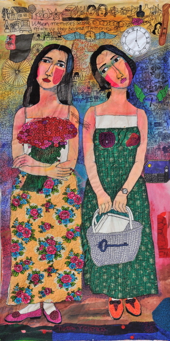 맨드라미를 품은 여인_112x175cm_천위에 바느질 드로잉 및 아크릴 칼라