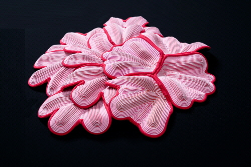 장수연 - 원광디지털대학교 한국복식과학과 우리나라 전통 자수인 <색실누비 손바느질> 기법을 사용하여 피어나는 꽃을 형상화한 작픔이다. 기존의 색실누비 작품들이 평면에 그려진 회화와 같은 이미지였다면 본 작품은 입체감이 살아있는 조형 작품이라는 점에서 차별점을 갖는다고 볼 수 있다.