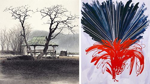 이선우 作_中原所見_66x70.5cm_화선지에 수묵담채 (좌) 강주영 作_emotion shape #1_90.9x72.7cm_acrylic on canvas_2022 (우)