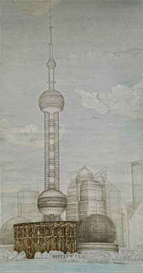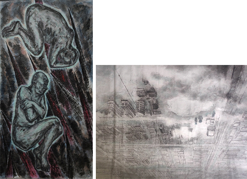 梁紫祥(LIANG ZIXIANG) 作_NOWHERE CAN GO_140x75cm_한지에 채색_2022 (좌) 聂菁(NIEJING) 作_안개의 도시_62x88cm_화선지, 먹, 붓_2022 (우)
