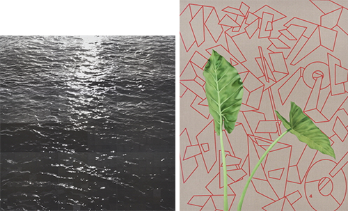 권세진 作_바다를 구성하는 576개의 드로잉(576 Drawings forming the sea)_ 종이에 먹(ink on paper)_240x240cm(each 10x10cm, 576pices)_2020 (좌) 금보성 作 (우)
