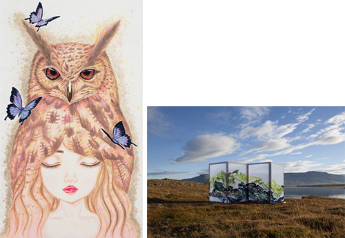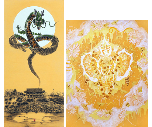 오아 作_순간, 윤환 - 공존_116.8x91.0cm_장지에 먹과 분채_2022 (좌) 이주아 作_Imagine it 2_90.9x65.1cm_장지에 채색_2021 (우)