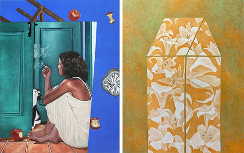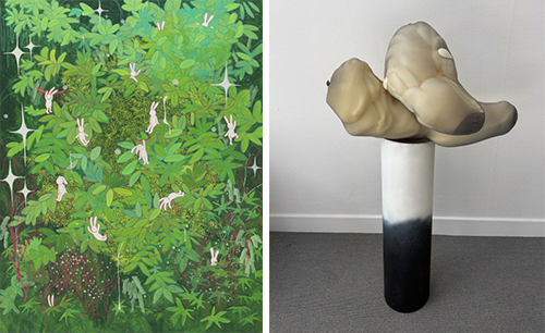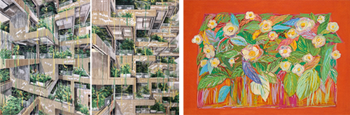 손정은 作_도시숲 2(Urban Jungle)_60x80cm 2EA_장지에 채색_2019 (좌) 송채연 作_my flower hut 22-58_116.8x80.3cm_장지에 혼합재료_2022 (우)