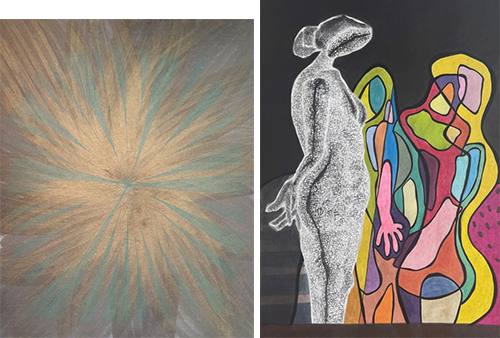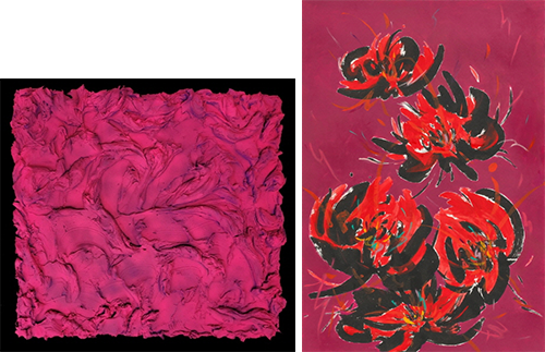 신재호 作_layer 2_판넬에 헨디코트, 아크릴_53x45.5cm_2021 (좌) 신혜진 作_花樣年華 화양연화_장지에 먹, 아크릴 과슈, 오일파스텔_100x68cm_2020 (우)