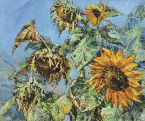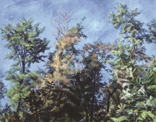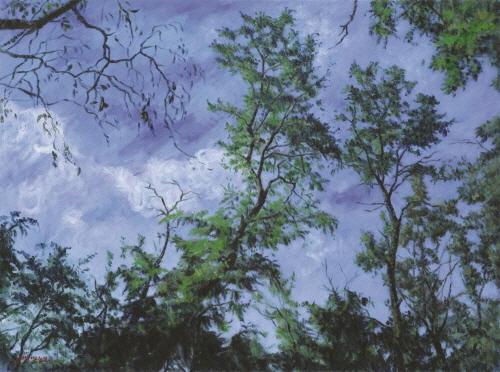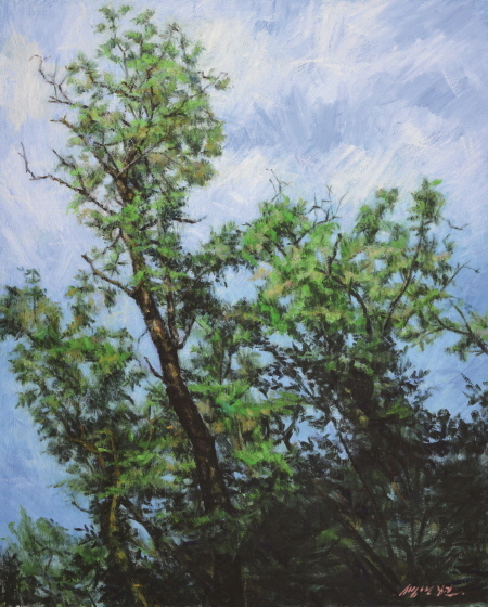 장순현의 숲과 나무를 그린 풍경화는 힘차고 활달하다. 하늘을 향한 나뭇가지 끝에서 하늘은 시작된다. 트인 하늘은 사람이 꿈꾸는 몽상적인 공간이다. 화가의 시선은 나무를 향하다 막힘없는 투명한 하늘로 이어진다. 거친 숲은 욕망의 세계이며 트임의 하늘은 활력을 제공하는 해방의 공간이다. 무질서한 숲과 하늘을 향하는 나무를 그린 풍경은 분산된 색채, 자연을 바라보면서 느끼는 상실감이나 슬픔이 묻어나는 분위기의 풍경이 묘한 매력을 품고 있는 듯하다. 신성한 숲의 바람과 빛을 그리는 화가는 자신만의 정신을 세운다. 풍경화는 자연을 향한 목마름이며 자연의 정신적인 가치를 담는다. 자연에는 생명의 역동성이 잠재하고 있다. 푸른 하늘을 배경으로 그린 나무 그림이 인상적인 이유다. 색채의 공명이 만들어 내는 푸른색이 경이로움을 더한다. 특히 숲과 나무는 타오르는 듯한 생명이 드러난 은유다. 특히 나무는 뿌리 깊은 터를 만들어 하늘로 솟아오르는 형상이다. 한 그루의 나무일지언정 생명의 깊은 뿌리에 대해서는 어떤 위대한 인간보다 아득했던 깊은 시간이 있다. 자연은 반복을 지속하는 원리를 가진다. 나무는 하늘로 성장하지만, 땅으로도 성장한다. 이런 생명의 원리가 순환하고 영원회귀하는 구조다. 자연은 침묵과 소음의 이중주이다. 화가에게 구성과 표현은 작가만의 심리 구조가 미적 표상으로 드러나는 것이다. 나무와 숲 일부를 그린 풍경화는 실존을 인식하는 차원의 열린 공간으로 그를 대변하는 듯하다. 의식이 그 대상과 어떤 관계를 맺고 있는지는 장순현 화가에게 중요한 단서가 된다.
