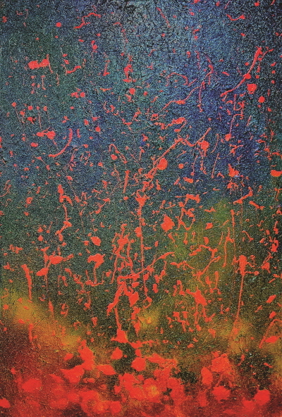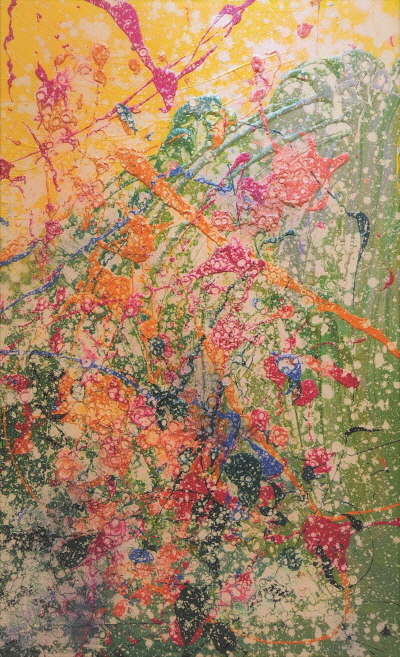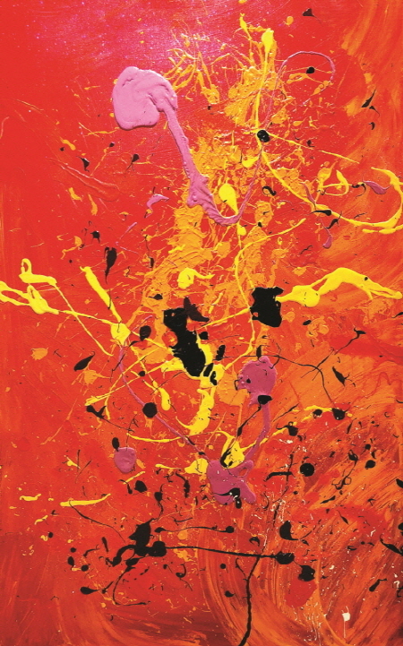 한편 문을 소재로 한 평면적인 이미지의 작업은 이지적이고 논리적인 사고를 기반으로 한다. 처음부터 계획되고 의도된 대로 작업을 진행하는 것이다. 지극히 단순한 시각적인 이미지이지만 그처럼 간결하게 압축하기 위해서는 비례감각에 대한 이해가 선행하지 않으면 안 된다. 제한된 색채만으로 이루어지는 단순 평면이기에 최적인 이미지를 찾아내는 건 쉽지 않은 일이다. 작품 숫자가 많지 않아 그 전모를 파악하기는 어렵지만, 작업량이 늘어가면 적합한 비례를 찾는 감각 또한 좋아질 것으로 보인다. 추상회화에서 흔히 쓰이는 흘리기나 뿌리기 등의 기법을 중심으로 하는 작업은 물감의 축적으로 인한 복잡한 구성임에도 색채의 조화로 인해 혼란스럽지 않다. 크고 작은 점이나 선 그리고 반점과 같은 이미지들이 혼재하는 상황에서도 다채로운 색채의 조화는 아름답다. 그러고 보면 그는 아름다운 색채이미지에 대한 감각은 타고난 게 아닌가 싶다. 한마디로 그림은 아름다워야 한다는 대전제를 충족시키는데 필요한 감각은 선천적이라는 얘기다. 이상에서 살펴보았듯이 그의 추상회화는 일천한 화력에 대한 불안감을 일거에 씻어낼 만한 수준의 안정적인 조형감각을 가지고 있다. 세상에 자신의 존재감을 알리는 첫 작품 발표전을 통해 한 걸음 성큼 진전할 수 있으리라 기대된다.