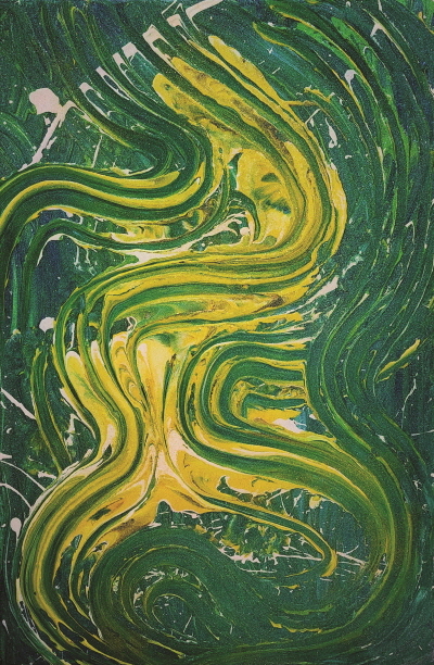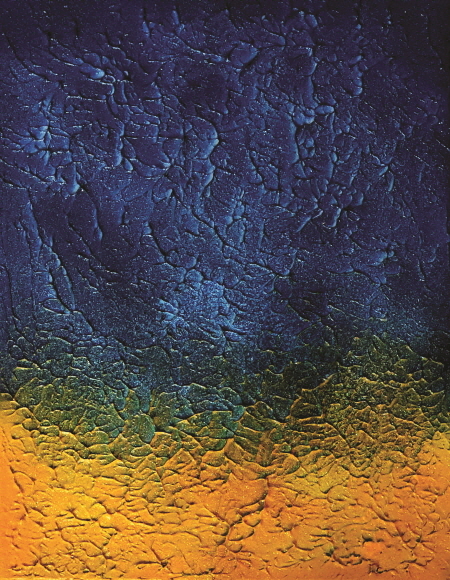 이들 작업 가운데 눈에 띄는 형식의 하나는 흡사 지렁이가 기어간 듯싶은 구불구불한 이미지가 화면 전체를 채우고 있는 모양새다. 깊게 파인 흔적처럼 보이는 이러한 이미지는 유려한 리듬을 촉발한다. 마치 살아 움직이는 걸로 착각하기 쉬운 이미지이다. 더구나 그 이미지는 마치 부조처럼 음각 형태로 자리하면서 화면에 동적인 활력을 불러일으킨다. 방향성 없이 이리저리 자유롭게 움직이는 움푹 파인 선의 동세는 시각적인 쾌감으로 작용한다. 여기에 덧붙여 또 하나의 이미지가 존재한다. 자유롭게 움직이는 선과 다르게 일정한 리듬과 방향성을 가진 선이다. 힘차고 빠르고 명확한 제스처로 유려한 흐름을 만들어내는 선은 신체적인 힘과 긴 호흡을 반영한다. 작가의 신체적인 힘이 어떻게 회화적인 이미지로 변환하는지 여실히 보여주는 것이다. 이러한 표현기법 또는 표현 방법은 신체적인 힘을 이용한 액션 페인팅의 한 지류라고 할 수 있으나, 음각 형태의 선은 뜨거운 추상의 보편성을 벗어난 것이다. 이처럼 움푹 파인 모양의 선은 손가락의 힘으로 이루어진다. 일종의 핑거페인팅이라고 할 수 있으나, 물감을 손가락으로 찍어다가 캔버스에 붙이는 일반적인 방법과는 다르다. 이때 질감을 나타내기 위해서는 물감 자체 또는 물감을 혼합한 미디엄과 같은 용재를 사용함으로써 부조와 같은 시각적인 이미지가 만들어진다. 진득한 물감의 덩어리가 굳기 전에 손가락으로 파내듯이 작업하는 일련의 과정이 머릿속에 선연히 그려질 정도로 그 이미지가 명료하다. 다시 말해 물감이나 물감을 섞은 미디엄을 두텁게 바른 뒤 마르기 전에 손가락의 힘을 이용하여 음각 형태의 선을 만드는 것이다. 손가락을 이용하는 표현기법이 새롭지는 않을지언정 자유로운 곡선이 이리저리 혼란스럽게 움직이는 듯싶은 시각적인 이미지는 그만의 조형감각이지 싶다. 이 작업에서는 단순히 손가락의 힘에만 의존하는 것은 아니다. 눈으로 읽히는 시각적인 이미지로서의 선은 어느 면에서 붓의 세밀한 표현보다도 더 깊고 섬세한 감정을 묻혀낸다. 손가락을 사역하는 것은 다름 아닌 감정과 미의식이기 때문이다.