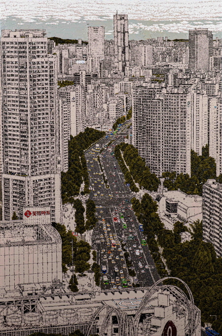 붓질의 파편과 본다는 것의 의미 ᅠ 작가 우병출의 풍경은 낯익다. 국내외 어딘가를 옮긴 도시와 시원한 바람이 부는 듯한 강가, 저 멀리 바다의 끝자락에 놓인 빌딩 무리는 비롯한 한적한 숲, 여유로운 어촌과 한 폭의 수묵처럼 자리 잡은 바닷가 풍경 등이 그렇다. 모두 기차나 버스를 타고 가다 혹은 거리를 걷다 발견할 수 있는 장면들이다. 상상되거나 가공되어 초현실적이지 않은, 누구나 한번쯤은 동일한 공간 안에서 접해봤음직한 광경이며, 현실에 기반 한 '일상의 풍경'이다. 인식 가능한데다 심리적 거리감마저 좁은 우병출의 풍경은 그저 우리가 삶을 지탱하는 공간을 화폭에 전사한 것이 아니라, 예민한 시각으로 포착하여 섬세함 필법으로 직조되어 있다. 어찌나 세밀한지 흡사 사진처럼 다가오기까지 한다. 때문에 작품을 제작하는 데 있어 많은 시간과 공을 들였음을 읽을 수 있다. 하지만 꼼꼼하게 표현된 형상들은 작가 스스로 칭한 '검은 눈동자로 세상 보기'의 결말이다. 즉, '본다는 것'에 대한 관한 나름의 답인 것이다. 타동사로써 본다는 것은 '시각화'의 다른 말이다. 구체적으론 3차원의 목적물을 2차원의 평면으로 압축하여 다시 공간으로 불러들이는 것으로, 흔히 이미지라는 이름으로 불린다. 이때 이미지화 된 목적물은 일차적으로 '모방'의 산물이다. 인터뷰 당시 작가는 언급하지 않았으나 그에게 본다는 건 '나'아닌 다른 객관적인 대상을 해석하는 방식으로, 목적물과 다른 목적물과의 관계를 제대로 파악하기 위한 방법이다. 그렇기에 그가 말한 '본다는 것'은 눈으로 대상의 존재나 형태적 특징을 이해하려는 노력을 비켜간다. 마지막으로 우병출의 그림들은 인식으로써 '알다'와 일맥상통한다. 안다는 것은 사물의 속성을 파안한다는 것이지만 동시에 이치를 제대로 깨닫는 것과 맥락이 같다. 하지만 외형과 내면의 상은 다르며, 생물학적 시각과 마음의 시각은 천지차이이다. 이처럼 우병출의 작업에서 본다는 것은 행위의 종착지이면서 대상에 대해 더 구체적으로 알아 가는 것, 자신 또한 자신에 의해 규정된 수많은 타자들 중의 하나가 되어버리는 것이라 해도 무리는 없다. 다시 말해 망막에 비치는 모든 것이면서 '어떠한 사실에 대해 의식이나 감각으로 깨닫거나 느끼다'는 의미도 포함된다는 것이다.