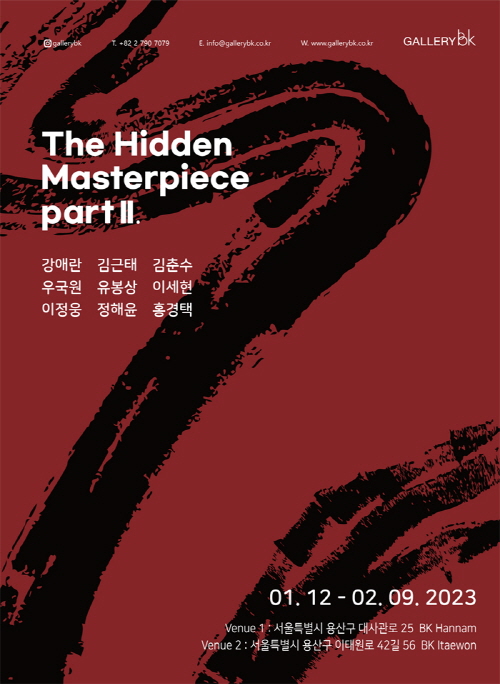 서울 한남동 Gallery BK는 지난 2022년 1월, 국내외 미술시장에서 방향성을 제시해온 영향력 있는 14인 거장들의 대규모 그룹전 <The Hidden Masterpiece part I. >을 기획한 바 있다. 1년 전 당시 미술계에 큰 이슈가 되었던 이 전시를 시작으로 2023년 1월, 9인의 중견 및 거장이 함께하는 <The Hidden Masterpiece part II. >를 새롭게 기획하였다. 이번 기획전에 소개되는 9인의 작가들은 국내는 물론 해외 컬렉터들에게도 사랑과 관심을 받음과 동시에 자신만의 화풍으로