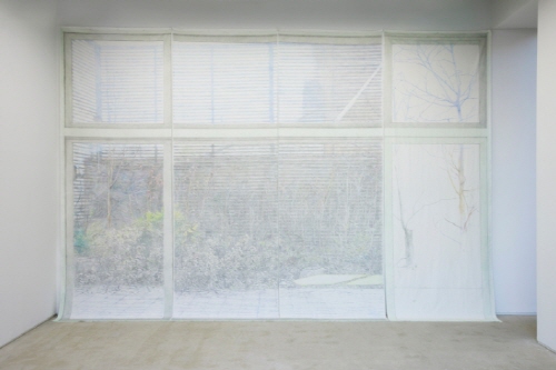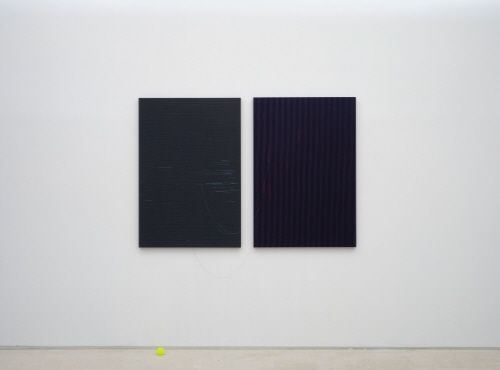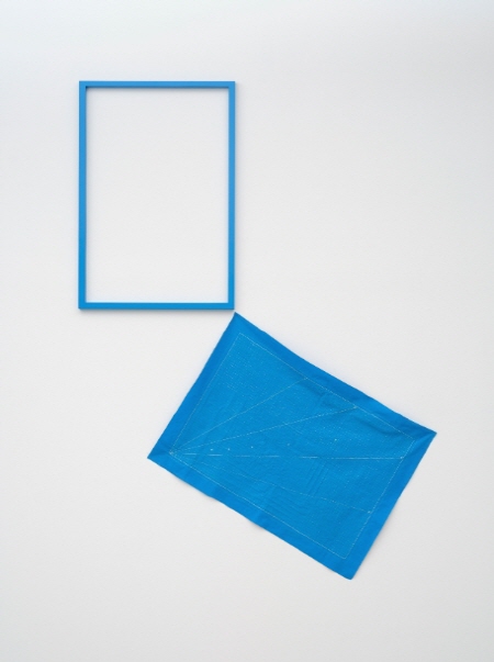 이번 전시는 4점의 작품으로 구성되어 있다. 우리는 누군가를 사랑할 때 그 상대의 말이나 행동을 유심히 관찰하게 된다. 그리고 어느새 상대의 말투나 행동을 흉내 내기도 한다. <닮아가는 벽>은 전시장 창문과 바깥의 풍경을 닮아가는 회화 작업이다. 마주 보고 있지만 거리를 좁히지는 못하고 그저 상대를 흉내만 낼 뿐이다. 그런데 창밖으로 보이는 풍경과 천 위에 그려진 풍(흉내 낸 풍경)은 계절의 차이를 보인다. 그렇다. 우리는 닮고자 하는 대상을 쫓아가지만, 그사이 그는 또 다른 지점에 가 있다. <꽉 잡은 손>은 각자 수직과 수평으로 서 있는 두 개의 막대기가 하나의 공을 붙잡고 있다. 공을 놓치지 않기 위한 그 둘의 애틋한 마음과 언제라도 쉽게 공이 떨어질 수 있다는 불안한 기류가 동시에 감지된다. 바닥에는 두 개의 공이 긴 막대기를 받치고 있다. 작가는 관람객이 직접 어떤 상황을 만들어낼 수 있도록 했다. 그들의 사랑이 해피엔딩일지 새드 엔딩일지는 관람객의 몫이다. <너의 등을 긁는다>는 서로 다른 패턴의 원단이 가느다란 실로 연결되어 있다. 각자의 모습은 다르지만, 상대의 가려운 등을 긁어주며 그 둘은 하나가 되고자 한다. <말하는 사람과 듣지 않는 사람 >에서 커팅 매트는 말하는 사람이고 프레임은 듣지 않는 사람이다. 커팅 매트는 자신을 팽팽하게 지탱해줄 프레임이 필요하지만, 프레임은 선뜻 자기 몸을 내어주지 않는 듯하다. 사실 프레임은 그 누가 와도 상관없다. 커팅 매트 역시 프레임에 씌워진다고 해도 어차피 자기 역할을 하지 못한다. 하지만 안타깝게도 그는 이 냉정한 현실을 아직 받아들이지 못하는 것 같다.