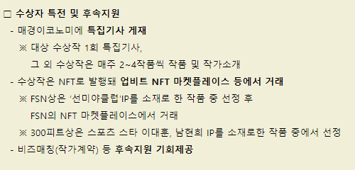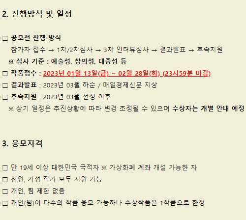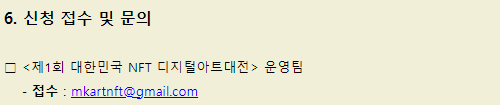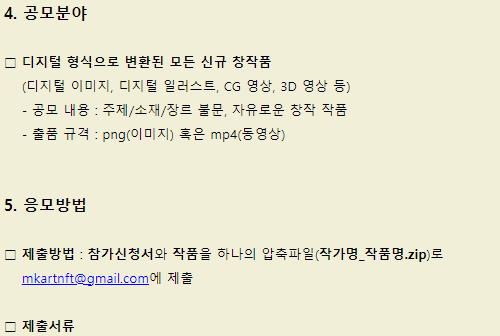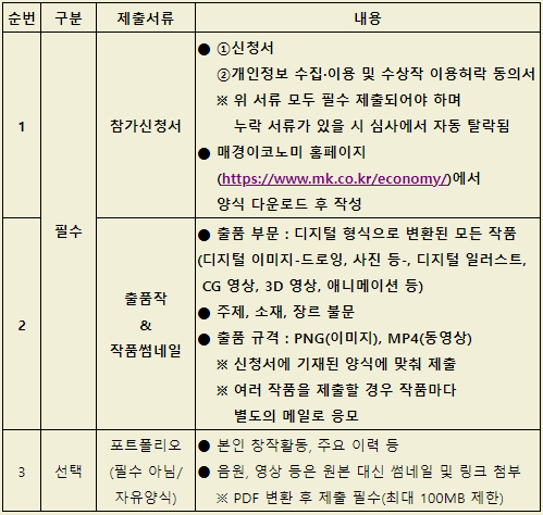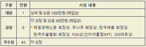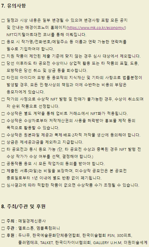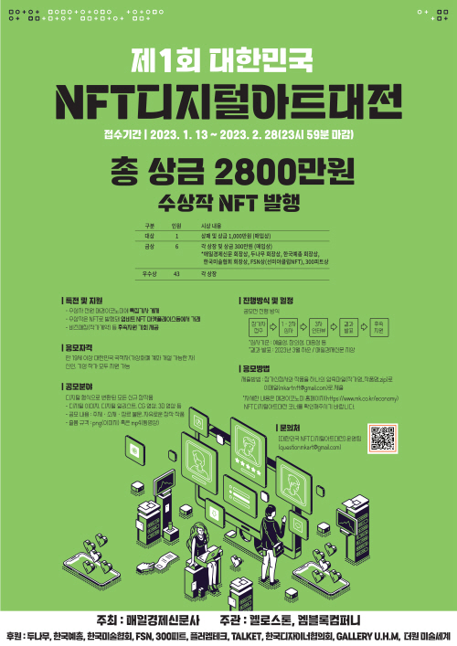 디지털아트 우수 작가 발굴 및 육성을 위한 [제1회 대한민국 NFT 디지털아트대전]이 21세기 디지털 문화 선도와 FINE ART 패러다임 전환기의 주인공이 될 창작자를 기다립니다. 신인, 기성 작가 모두 지원 가능합니다. 수상작은 NFT로 발행돼 국내 최대 NFT 거래소인 ‘업비트 NFT 마켓플레이스’에서 거래됩니다. 본 공모전은 매일경제신문사가 개최합니다. 관심 있는 분들의 많은 참여 바랍니다.