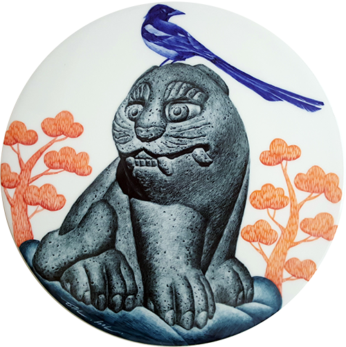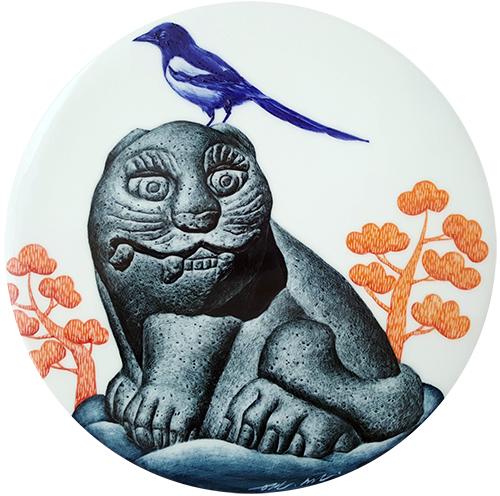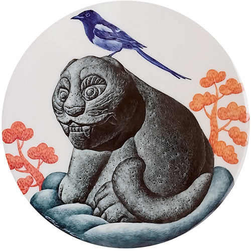 These works were produced with inspiration from Korea's Four Gods and Hojakdo. The painting of the Four Gods depicts the left blue dragon, right baekho, Jeonjujak, and Huhyeonmu, who protect the four directions. It is a work of art drawn by taking a picture of a stone sculpture of the four gods placed outside Geunjeongjeon, the main palace of Joseon in Gyeongbokgung Palace, and engraving it on a ceramic board. to be. The magpie, which is familiar to us, is expressed as a blue bird symbolizing hope, with the four directional gods, and the meaning of hope and longevity is added to the work by appearing as the background of the work along with clouds and pine trees, the ten longevity symbols.