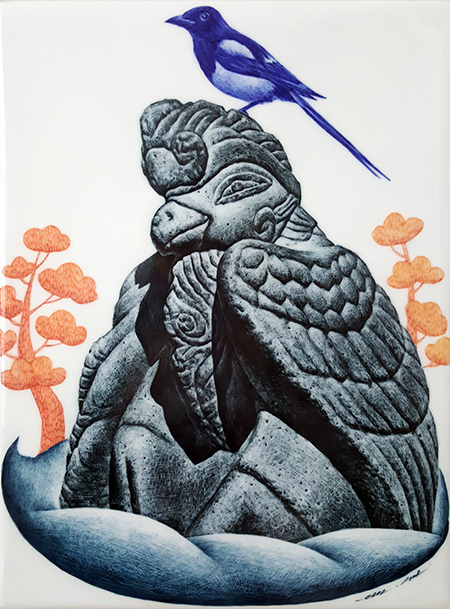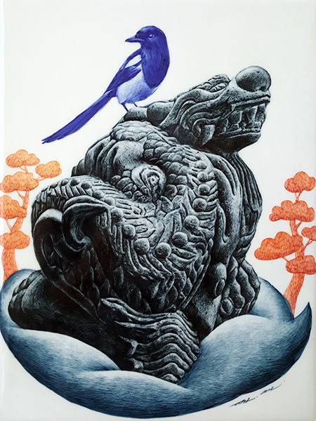 까치와 청룡_31x40cm_백자도판_1235℃ 산화소성_2022