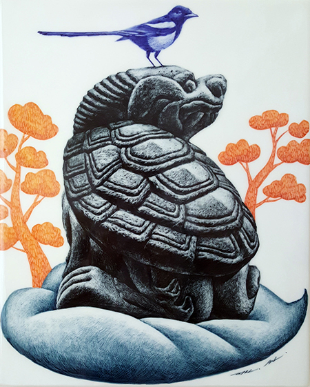 까치와 현무_38.5x31cm_백자도판 1240℃ 산화소성_2022