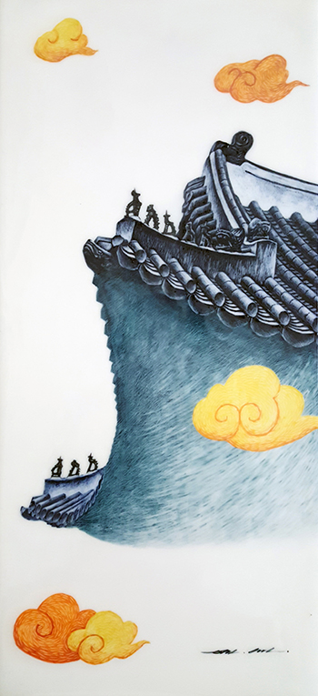 The method of producing my work is different from the general method of ceramic painting. The way to draw is to apply paint made using ceramic pigments to a ceramic slab and draw lines with a sharp tool to express an image. This work resembles the etching technique of printmaking, so I call it "Ceraching" (Ceramic+Etching). In this way, the painted work is coated with glaze and fired in a kiln at a high temperature of 1250 degrees before it is completed as a work of art. In the process of firing, the work may change, break, or lose its color due to the temperature of the kiln or various variables, but ceramic painting can only be encountered as a work of art after passing through these variables. Instead, the work created in this way has a long life span to endure a thousand years, just like the pottery we know.
