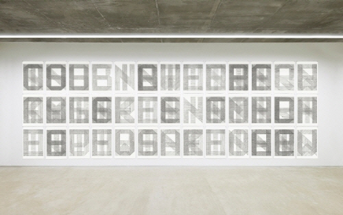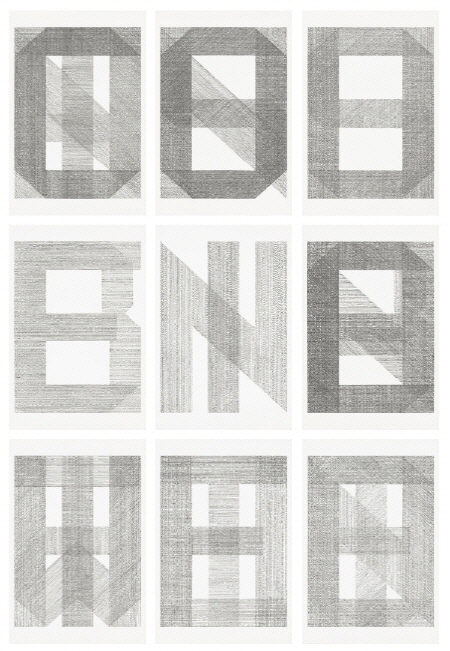 알렉산드라 로젠의 전시 제목은 모든 글자의 폭이 같은 글꼴을 의미하는 타이포그래피의 용어, ʻ모노스페이스(Monospace)’에서 기인했다. 이번 개인전을 통해 처음으로 공개되는 TRACES 시리즈는 이 모노스페이스 방식을 응용해서 글자를 층층이 쌓아 올린 작품이다. 그런데 TRACES 시리즈 외에 기존의 MONO 시리즈와 FEW 시리즈도 함께 선보이는 전시에 그가 < MONO SPACES >라는 제목을 붙인 이유는 무엇일까. 작가는 TRACES 시리즈를 진행하기 전부터 작업을 시작할 때 일정한 그리드를 기반으로 했기 때문에 자신은 이미 그 방식을 사용하고 있다는 것을 깨달았다고 한다. ʻ모노스페이스’는 그의 모든 작업에 내재된 규칙이다.