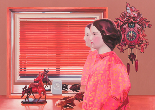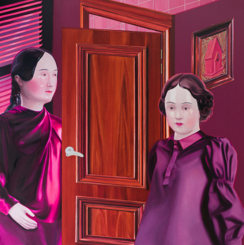 한편 이들은 다양한 장소에서 등장한다. 작가의 침실이, 사방이 문으로 가로막힌 곳이, 혹은 인간이 아닌 동물이 머무를 집과 안뜰이 그림의 배경이 되었다. 특히 그의 근작들에서 두드러지는 건축적 요소들은 화면을 보다 복잡하게 변형시킨다. <멈춰버린 순간>속 거울은 사슴의 앞모습과 뒷모습을 겹쳐보게 하고, <블루문>의 유리창은 등장한 인형을 외부로부터 내부로 끌어들인다. 또 <정지된 시간의 방을 향하여>나 <닫힌 문>에서 반복적으로 등장하는 문은 주어진 공간을 사방으로 분할하면서도 연결할 수 있다. 중요한 사실은 이 장벽들이 언제든 현실의 차원을 다른 영역으로 이동시키는 포털이 될 수 있다는 것이다. 요컨대 문과 창, 벽, 액자 틀의 구조물은 얕은 생명을 오래도록 기억하고, 곧 사라져버릴 작은 존재의 이면을 탐닉하고 마주하고자 하는 작가의 의지를 드러내는 장치로 볼 수 있다.