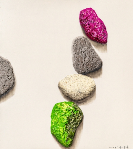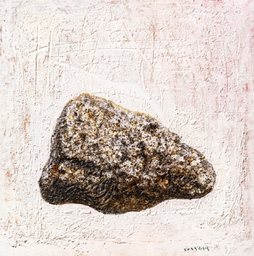 이번 개인전에서 하석홍은 다시 조용한 변화를 보여주고 있다. 그 변화의 과정은 세 개의 시리즈를 통해 확인된다. 이른바 캔버스에 바위의 질감을 색면 추상처럼 깔아놓은 작업 시리즈, 그 바위의 표면에 자라는 석화 이미지를 나타낸 작업 시리즈, 그리고 돌맹이의 형상과 그 표면를 덮은 석화 이미지를 종합해 놓은 작업 시리즈가 그것이다. 이들 세 개의 시리즈 저변에 흐르는 공통적 주제 의식이 있다면 그것를 환경, 생태, 생명, 자연이라는 키컨셉으로 요약할 수 있을 것이다. 이 주제들은 문명사적 전환기로 불리우는 오늘날 지식사회의 담론들이다. 하석홍의 세가지 돌 시리즈에는 순수 추상의 세계에 대한 관심과 더불어 질료와 형상 자체에 대한 시선 그리고 이 본질과 순수의 터에 자라는 석화(지의류)를 통해 서사적 메시지를 드러내려는 의도가 서로 융합되어 있음을 보게 된다. 땅의 옷이란 의미를 지닌 지의류(地衣類)는 바위나 나무에 달라붙어 자라는 생물이다. 이렇듯 작가의 작업에서 위에 적은 동시대의 키컨셉을 발견할 수 있는 것은 여간 반가운 일이 아닐 수 없다.