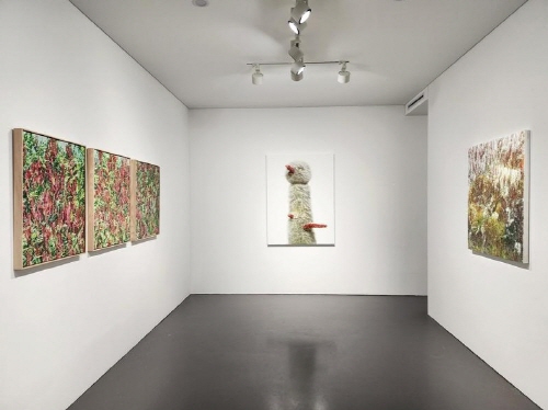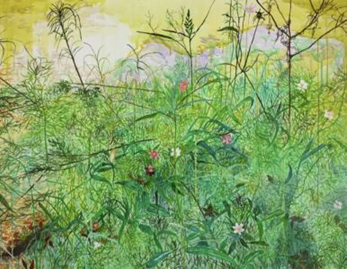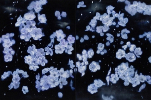 김정선 작가는 짧게 피었다가 지는 배꽃의 찬란한 순간을 담은 <배꽃>연작과 봄의 시작을 알리는 <산수유 꽃>작품을 선보인다. 김정선 작가는 꽃이 피어나는 순간의 조용한 울림을 표현하고자 스케치를 한 번에 끝내지 않고, 꽃 한 송이를 그리고 칠한 뒤 그 형태와 크기에 대응하는 또 다른 형태와 방향의 꽃송이와 꽃잎을 그린다고 한다. 그래서 김정선 작가가 보여주는 꽃은 그 형태가 명확하기 보다는 바람에 흩날리고 있는 듯한 움직임이 느껴진다. 김정선 작가의 꽃은 아름답게 피어있는 시간이 그리 길지 않은 꽃의 ‘유한한 아름다운 순간’과 ‘그리움’, ‘상실의 아픔’을 담고 있다.