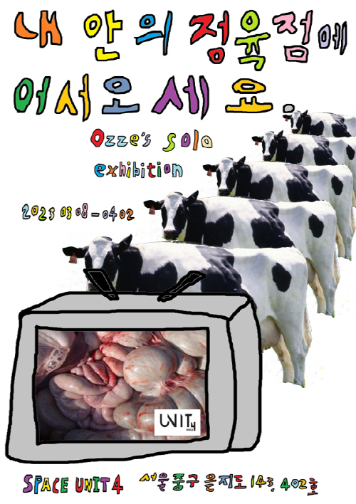 을지로 143에 위치한 SPACEUNIT4에서 장오제의 개인전 《내 안의 정육점에 어서 오세요》가 2023년 3월 8일(수)부터 4월 2일(일)까지 열린다.