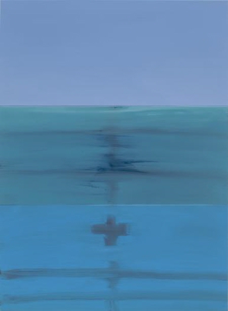 이번 전시에서 소개하는 바이런 킴의 신작 역시 장소와 신체적 현존의 접합점을 탐구한다. 〈B.Q.O.〉라는 연작 제목은 바다를 배경으로 하는 유명 소설의 세 주인공 이름에서 따온 알파벳으로 구성된다. 스타니스와프 렘의 『솔라리스』 주인공 버튼(Berton)에서 B, 허먼 멜빌의 『모비 딕』 중 퀴케그(Queequeg)에서 Q, 호머의 『오디세우스』에서 오디세우스(Odysseus)의 O를 가져온 것이다. 각 서사에서 바다와 씨름하는 이 세 명의 영웅적 인물들은 작가가 2020년 1월 라우센버그 레지던시를 위해 캡티바 섬(Captiva Island)에 머물며 이 소설들을 다시 읽는 과정에서 그의 상상력을 자극했다 한다. 플로리다 남부의 외딴섬에서 작가는 카약을 타고, 수영을 하고, 패들보드를 타며 한 달을 보냈다. 이러한 수중 환경에 놓인 작가에게 있어 소설 속 세 인물은 바다가 인간의 고군분투를 은유하는 대상이 될 수 있음을 새삼 상기시켰던 것이다. 각 〈B.Q.O.〉 작품은 수직으로 쌓아 올린 세 개의 캔버스 패널로 구성된다. 가장 위의 화면은 바다에서 바라본 하늘을, 가운데 화면은 물의 표면과 그에 반사되는 모습을, 그리고 가장 아래의 화면은 물속의 모습을 포착한다. 색조의 부드러운 변화와 섬세한 붓질은 추상화의 감각뿐만 아니라 물질적 특정성과 물의 분위기를 환기시키는데, 이로써 회화라는 매체 자체를 은유하며 독해 가능성과 불가능성 사이의 문턱에서 회화가 점유하는 고유한 지위를 암시한다. 초창기 〈B.Q.O.〉 작품들이 바다에 대적하는 인간의 신화적 판타지에 집중했다면, 국제갤러리 부산점에서 선보이는 최신 작품들은 물에 대한 보다 직접적인 탐구에 기인한다. 이는 팬데믹 봉쇄 기간 중 수영이라는 단순하고도 구체적인 활동에 집중했던 작가의 경험에서 비롯된다. 코로나 기간 중 일 년의 시간 동안 작가와 그의 가족은 샌디에이고에서 생활했는데, 샌디에이고는 그가 어린아이로서 바다를 처음 만났던 곳이자 그의 노부모가 아직 거주하는 지역이기도 하다. 그곳으로 돌아간 작가는 다시 물과 조금씩 가까워지며 그 광활한 바다에서 위안을 찾게 되었다. 그 이후로 작가는 태평양 연안의 라호야(La Jolla) 해변에서 코네티컷주의 토비 연못, 뉴욕과 샌디에이고의 실내 수영장들에 이르기까지, 물에 이끌려 오며 물의 표면을 관찰하는 행위와 잠수 사이에서 줄타기하며 물에 대한 스스로의 친근감을 고찰해왔다. 이렇게 작가는 자신의 새로운 관심사를 인식의 과정에 대한 오랜 고민과 접목시켜 자연세계와 신체를 주요 소재로 작업하게 된 것이다.