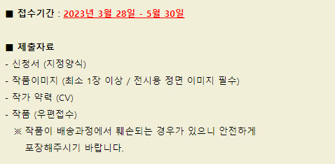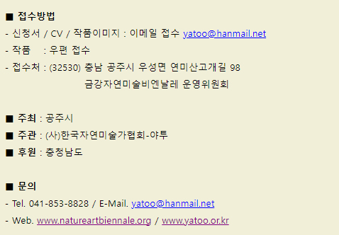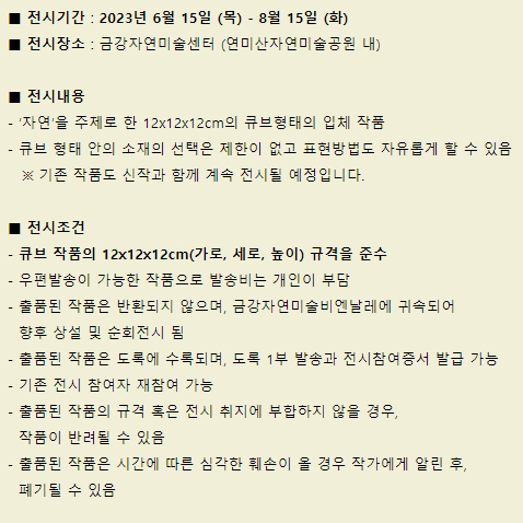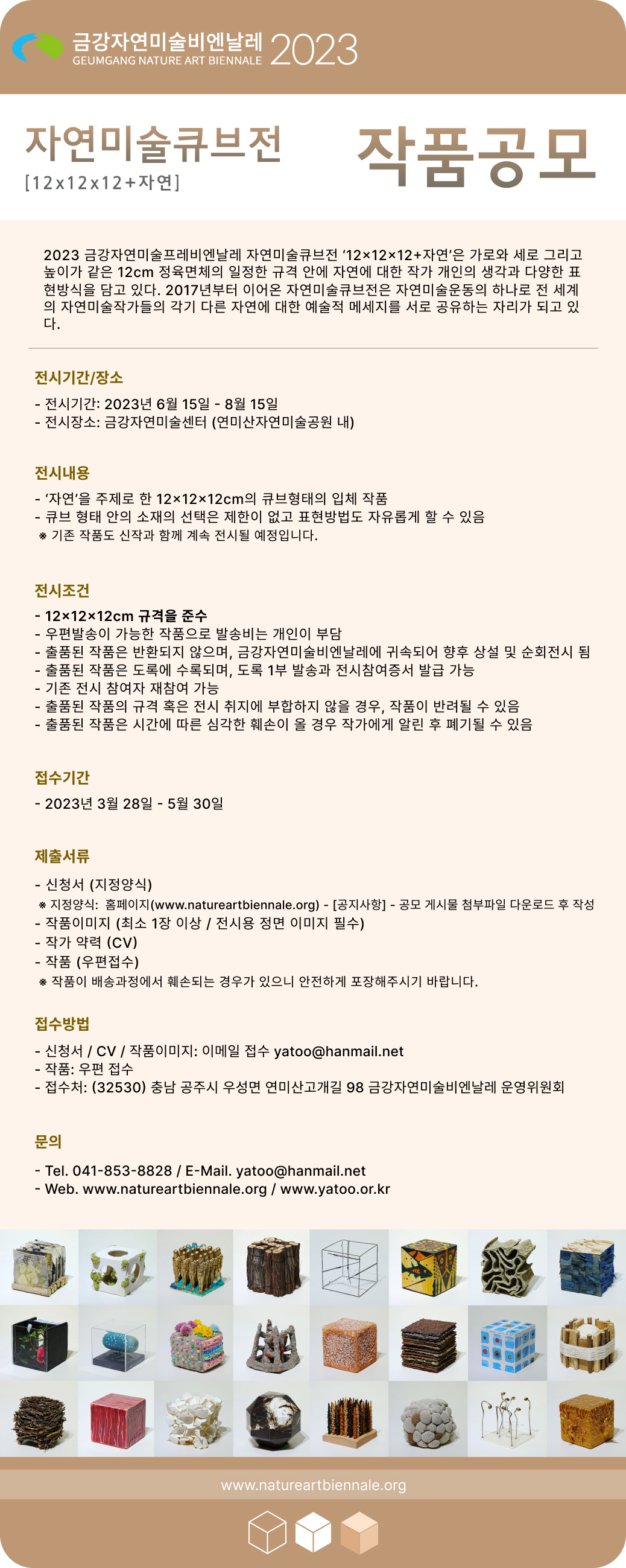 * 전시메일에 등록된 모든 이미지와 글은 작가와 필자에게 저작권이 있습니다. * vol.20230328-2023 금강자연미술프레비엔날레 자연미술큐브전 작품공모 |