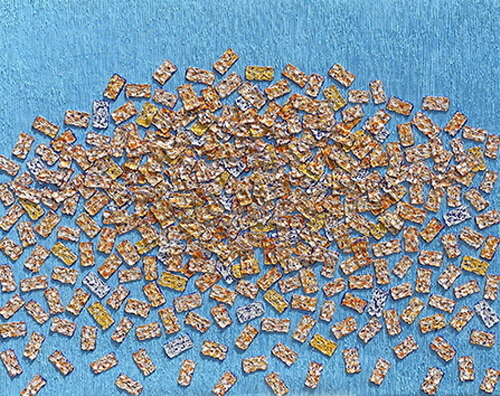 그런가하면 때로 단위원소를 얼기설기 엮어서 구조적이고 구축적인 화면을 재구성하기도 하는데, 구조가 느슨하기도 하고 촘촘하기도 한 다양한 표정의 화면을 연출한다. 단위원소와 단위원소 사이에 일종의 빈 공간을 마련하는 것인데, 때로 상당부분의 공간을 비워내 허허로운 화면을 연출하기도 한다. 여기서 단위원소에 해당하는 오브제 하나하나는 마치 먹그림에서의 필이며 선과도 같고, 더욱이 여백에 대한 공간 감각이 한국화 베이스를 가지고 있는 작가의 또 다른 이력을 떠올리게 만든다. 각각 한국화 베이스와 조각 베이스가 그 경계를 허물고 융합되면서 작가만의 독특한 회화적 아이덴티티로 정착되고 승화된 보기 드문 경우로 볼 수가 있겠다. 이 일련의 그림들을 작가는 D(dimensional) painting이라고 부른다. 차원회화? 차원을 여는 회화? 다중 혹은 다층차원회화? 아마도 어느 정도 이 모두를 함축적으로 의미할 것이다. 상호간 이질적인 차원이, 이를테면 회화적 평면과 조각적 입체, 추상적 형식논리와 형상적 재현논리, 그리고 의미론적으로 겉과 속, 안과 밖과 같은 이분법적 개념과 현상의 경계를 허물고 하나의 층위로 중첩된 회화, 경계를 넘어서 또 다른 경계며 차원을 여는 회화를 의미할 것이다. 그리고 상호간 이질적인 차원들이 하나의 층위로 중첩된 존재의, 삶의 알레고리를 의미하기도 할 것이다. 여기에 시간과 세월이 만들어준 결과 겹이며, 켜켜이 내려앉은 지층과 주름이 존재의 흔적이며 상흔을 불러일으키는, 그런, 존재론적인 그림이고 작업이다.