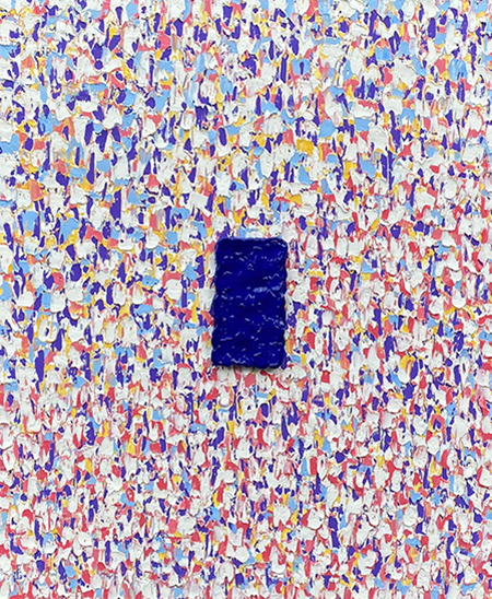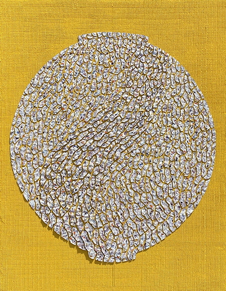여기까지가 몸에 대한 그리고 나무에 대한 관찰에서 유래한 존재의 이중성을 예시해주는 경우다. 그리고 작가의 작업은 확장국면에 들어선다. 단순히 나무며 껍질을 매개로 겉과 속을 대비시키는 것에서 나아가 보다 추상적인 경우로, 그 자체 자족적인 형식논리를 전개시키는 경우로 확장된다. 작가의 작업은 기본적으로 하나의 단위원소, 모나드, 단자가 반복 중첩되면서 이러저런 형태를 만드는 모듈구조를 취하고 있고, 이런 모듈구조가 임의적이고 자의적인 형태 변주를 가능하게 해준다. 이를테면 일종의 만든 혹은 제작된 오브제로 명명할 수 있는 단위원소를 화면에 병렬시켜 추상화면을 재구성하기도 하고, 무슨 모를 심듯 단위원소를 촘촘하게 세워 심어 추상적인 형태를 만든다. 무슨 피막 같기도 한 얇은 물감 막을 중첩시켜 만든 오브제를 재구성하는 방법과 과정을 통해서 표면질감이 두드러져 보이는 화면을 구성하기도 하고, 형태가 화면 위로 돌출돼 보이는 일종의 저부조 형식의 화면을 구성하기도 한다(보통 닥종이를 이용한 저부조 형식의 작업은 봤지만, 작가의 경우는 좀 이례적인). 때로 돌출된 화면이 빛에 반응하면서 보는 각도에 따라서 미묘하게 달라져 보이는 또 다른 감각경험(시각적이면서 동시에 촉각적인?)을 예시해주기도 한다. 여기서 이러저런 형태를 구성하는 단위원소에 해당하는 오브제 자체는 거칠고 질박한 나무껍질의 표면질감을 연상시키면서, 동시에 보기에 따라선 일일이 두드려 만든 단조처리한 철 조각의 표면질감을 떠올리게 한다. 질감이 강조되는 것도 그렇거니와 더욱이 저부조 형식의 작업이 평면과 입체, 회화와 조각의 경계를 넘나드는 또 다른 형식적 성취를 예시해준다. 아마도 조각 베이스를 가지고 있는 작가의 이력과 무관하지가 않을 것이다.