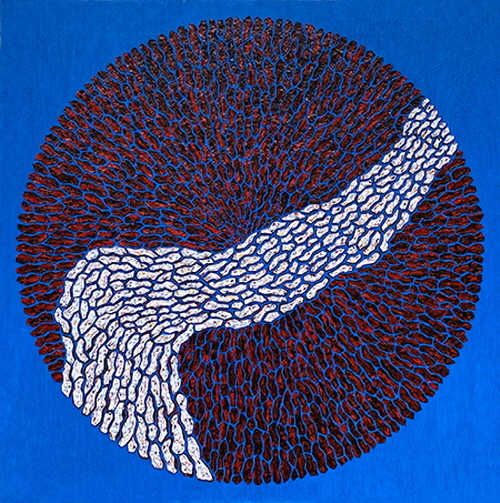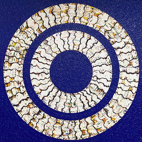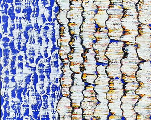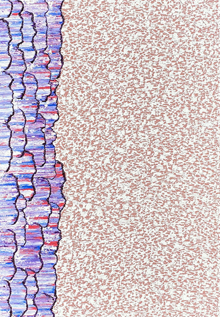 그렇게 나무껍질이 특히 소나무 껍질이 작가의 작업 속으로 들어온다. 처음에 작가는 나무껍질 그대로를 재현하는데, 그게 좀 예사롭지가 않다. 그린다고만 할 수도 그렇다고 만든다고만 할 수도 없다. 그리는 것도 만드는 것도 아닌, 어쩌면 그리기와 만들기가 혼재되면서 그리기와 만들기를 넘어서는 전혀 새로운 발상과 과정과 방법을 예시해준다. 이를테면 붓(그리고 때론 나이프?)을 이용해 투명 유리판 위에다가 나무껍질 모양으로 물감을 얇게 편다. 일종의 물감 막을 형성시키는 것인데, 그게 적당하게 굳으면 유리판으로부터 떼어내 캔버스에다 옮겨 붙인다(콜라주?). 그렇게 옮겨 붙이면서 막 위에 막을 쌓는다. 실제로 소나무 껍질을 보면 하나의 껍질덩어리처럼 보이지만, 사실은 얇은 막이 층층이 중첩된 구조를 이루고 있다. 나이테와는 또 다르게 시간의 켜를 쌓고, 보호막을 쌓고, 상처를 쌓는다고나 할까. 그렇게 중첩된 나무껍질 형상을 화면 속에 병치시켜 하나의 유기적인 전체형상의 나무껍질을 이루도록 조형을 완성시키는 것이다. 하나의 단위구조를 반복 병치시켜 부분과 전체가 유기적인 관계 속에 어우러지게 한 것인데, 여기서 유의할 점은 그 대상이 다름 아닌 자연인 까닭에 기계적인 반복구조와는 다르다는 사실이다. 자연엔 심지어 반복구조를 취할 때조차 사실은 같은 것이 하나도 없고, 실제로 작가의 작업 역시 그렇다.